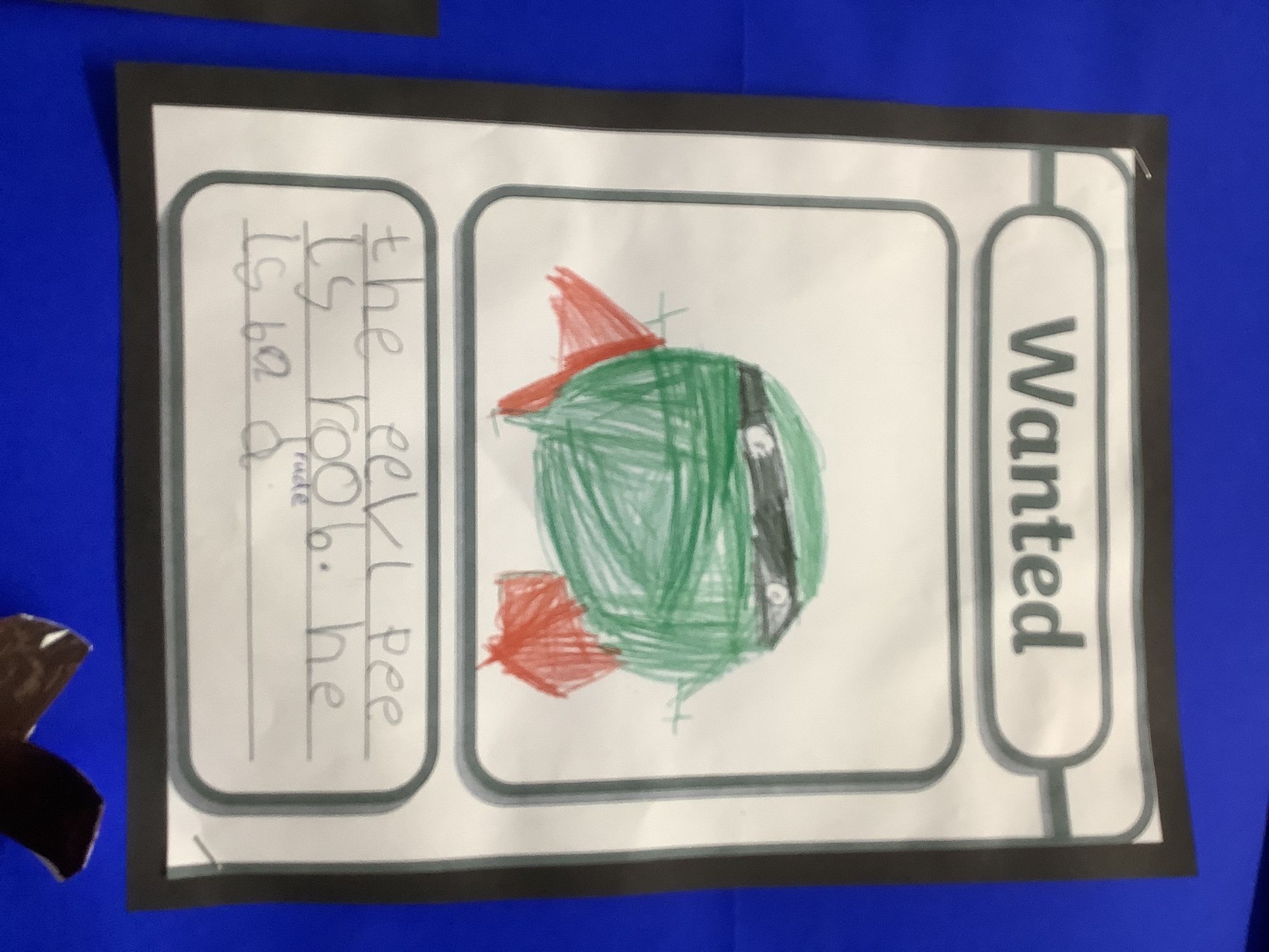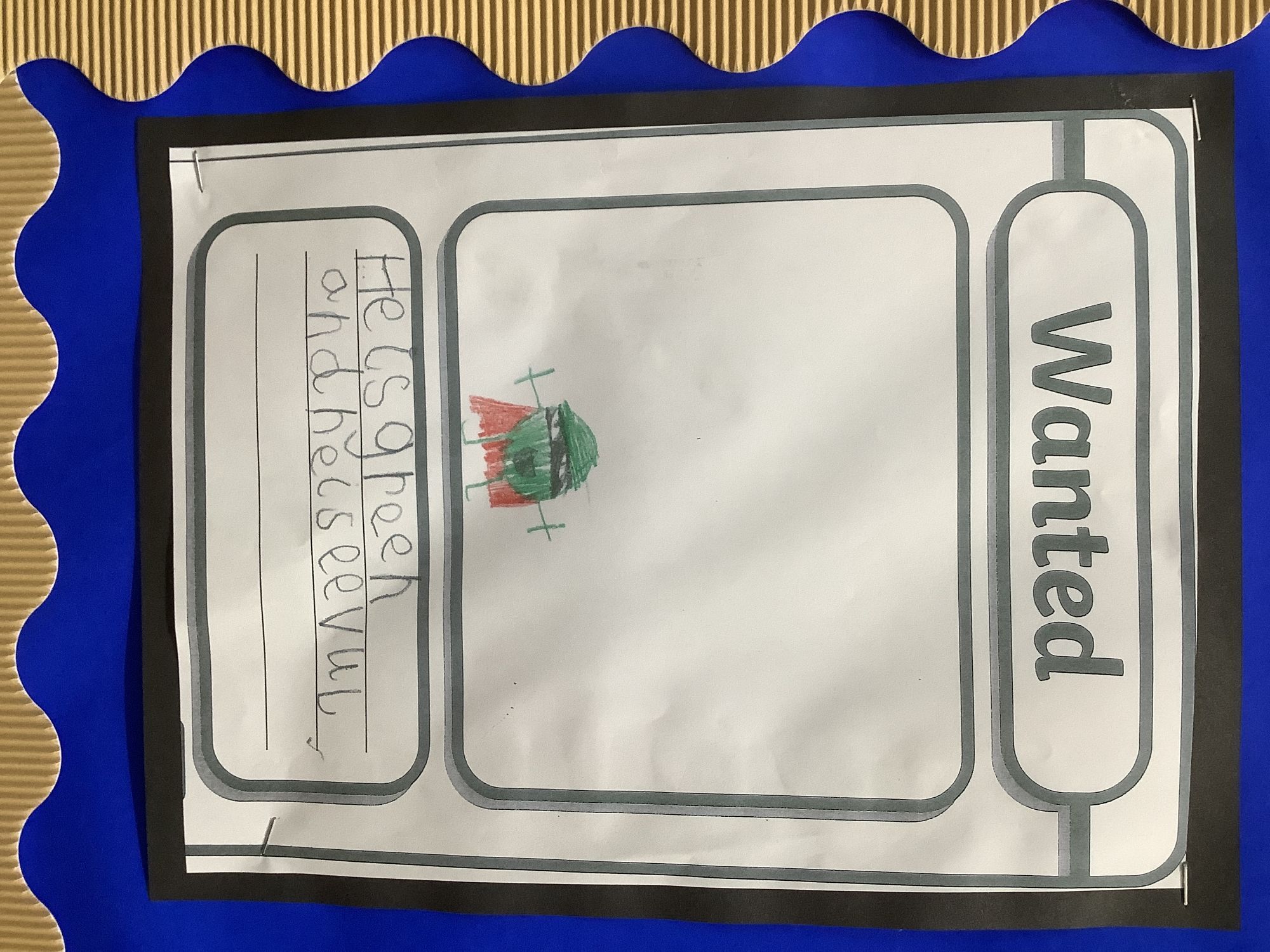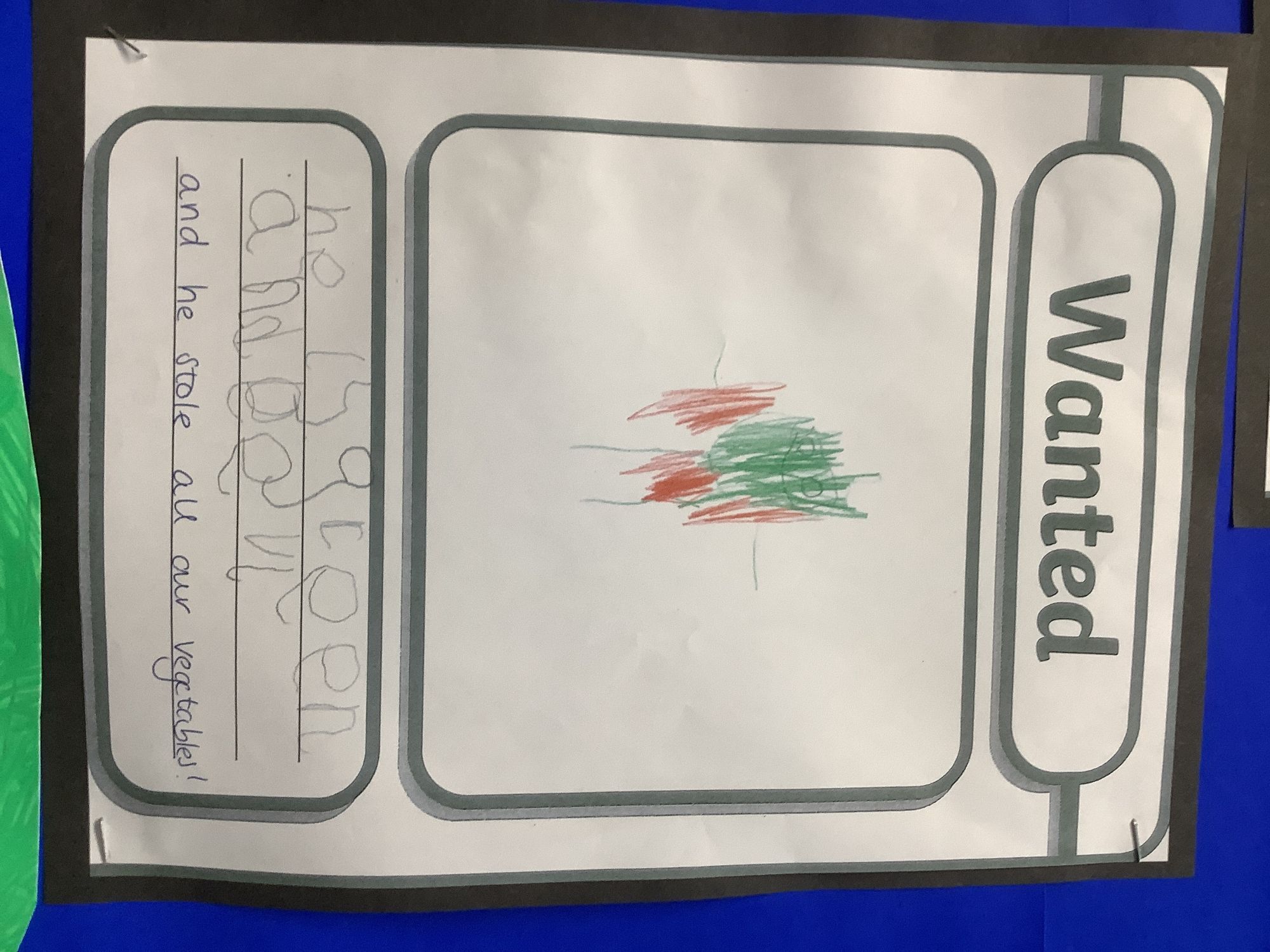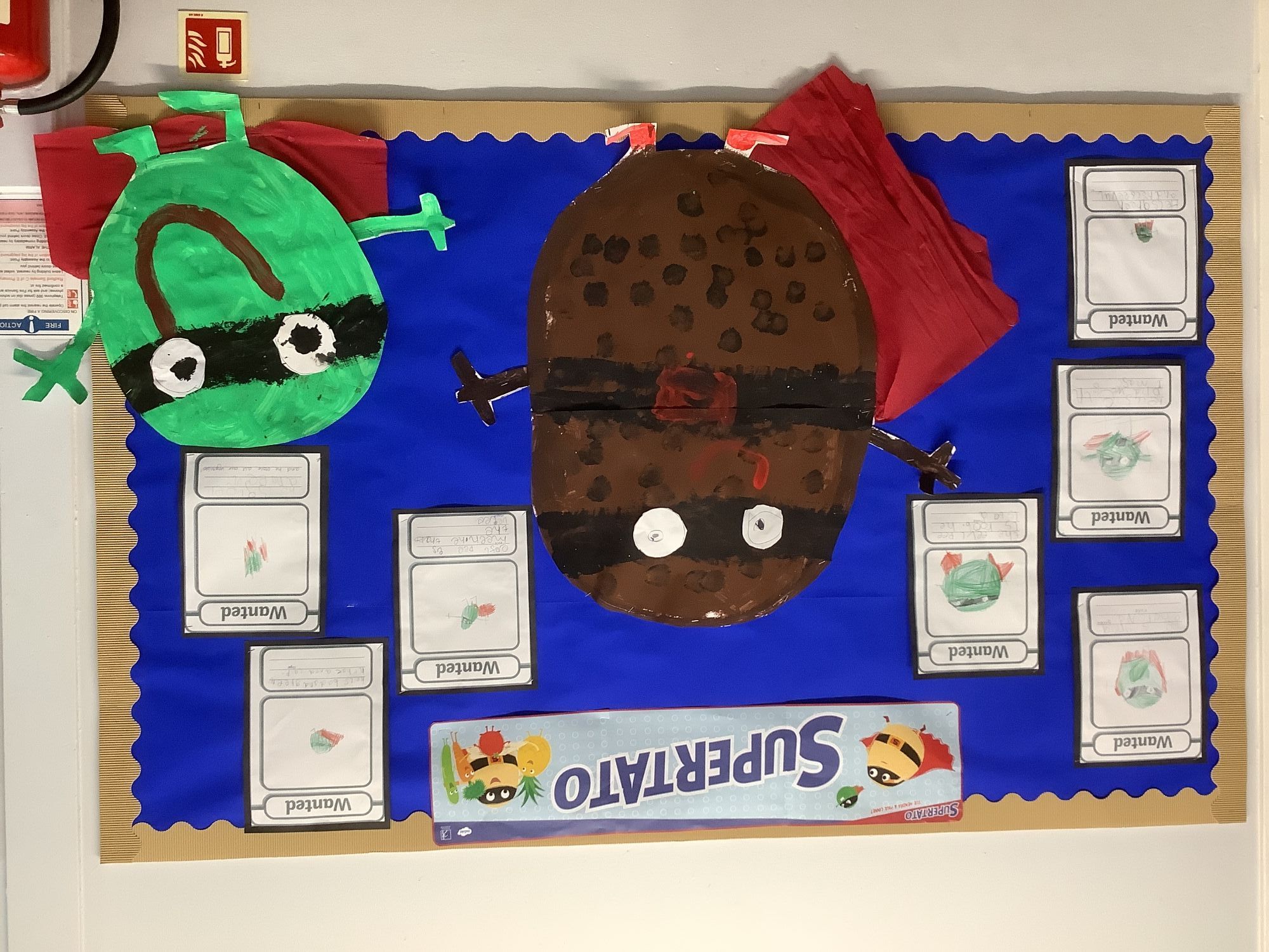 We came into our classroom and discovered that the evil pea had captured all the fruit and vegetables! We made wanted posters to help us find the evil pea. We created traps in the workshop and made our own Supertato.