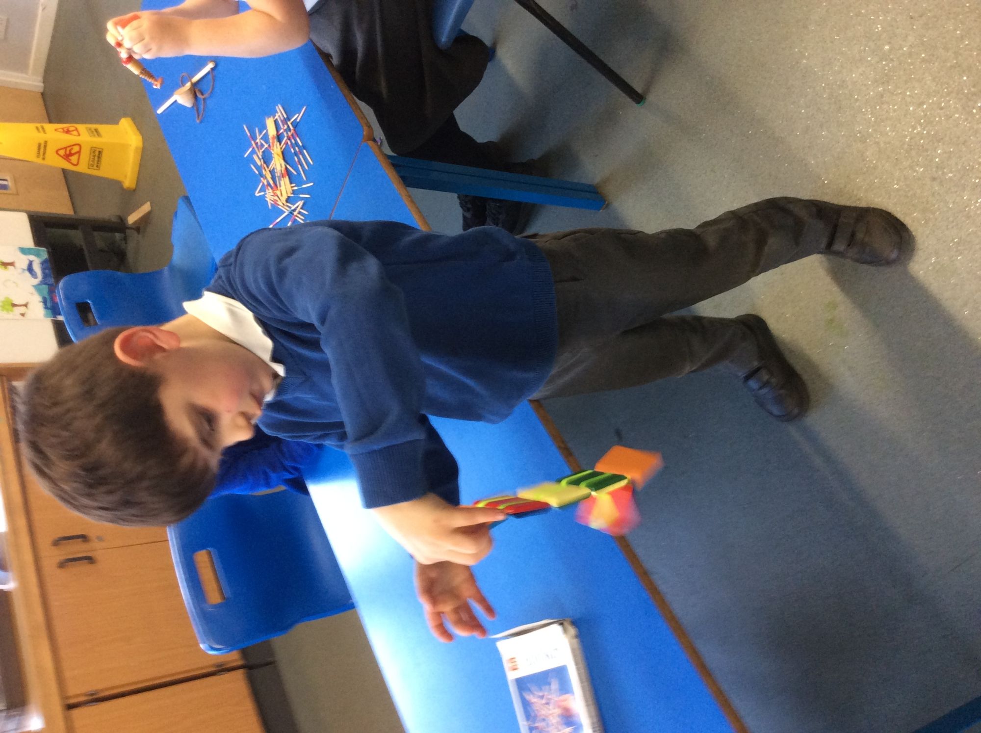 We have used familiar Traditional Tales to develop our English skills to build and write sentences. These stories have also allowed us to be creative, particularly with construction. We tried to make each of the Three Little Pigs' houses, mixed porridge for Goldilocks, and challenged ourselves to create tall beanstalks using different objects.
