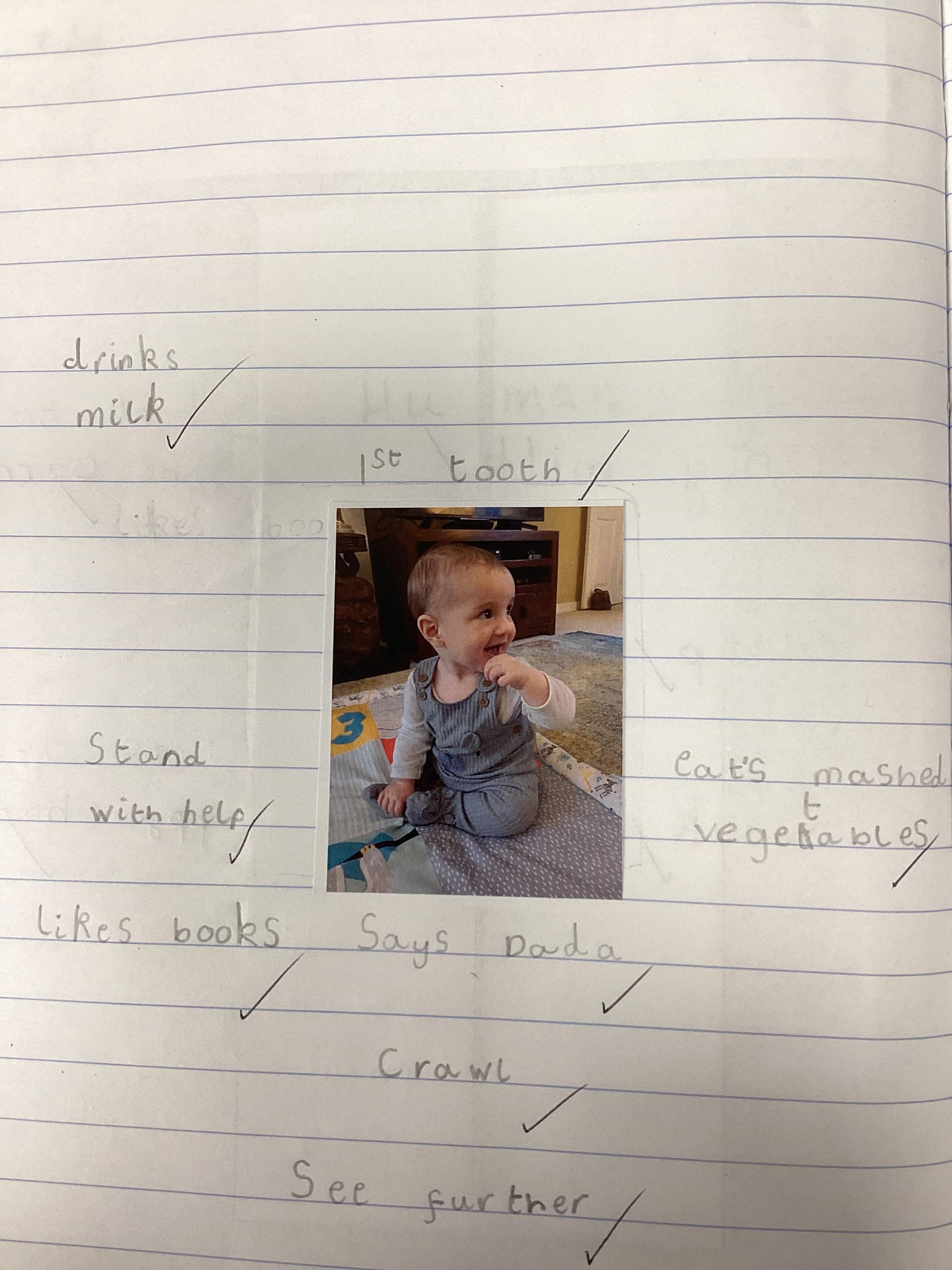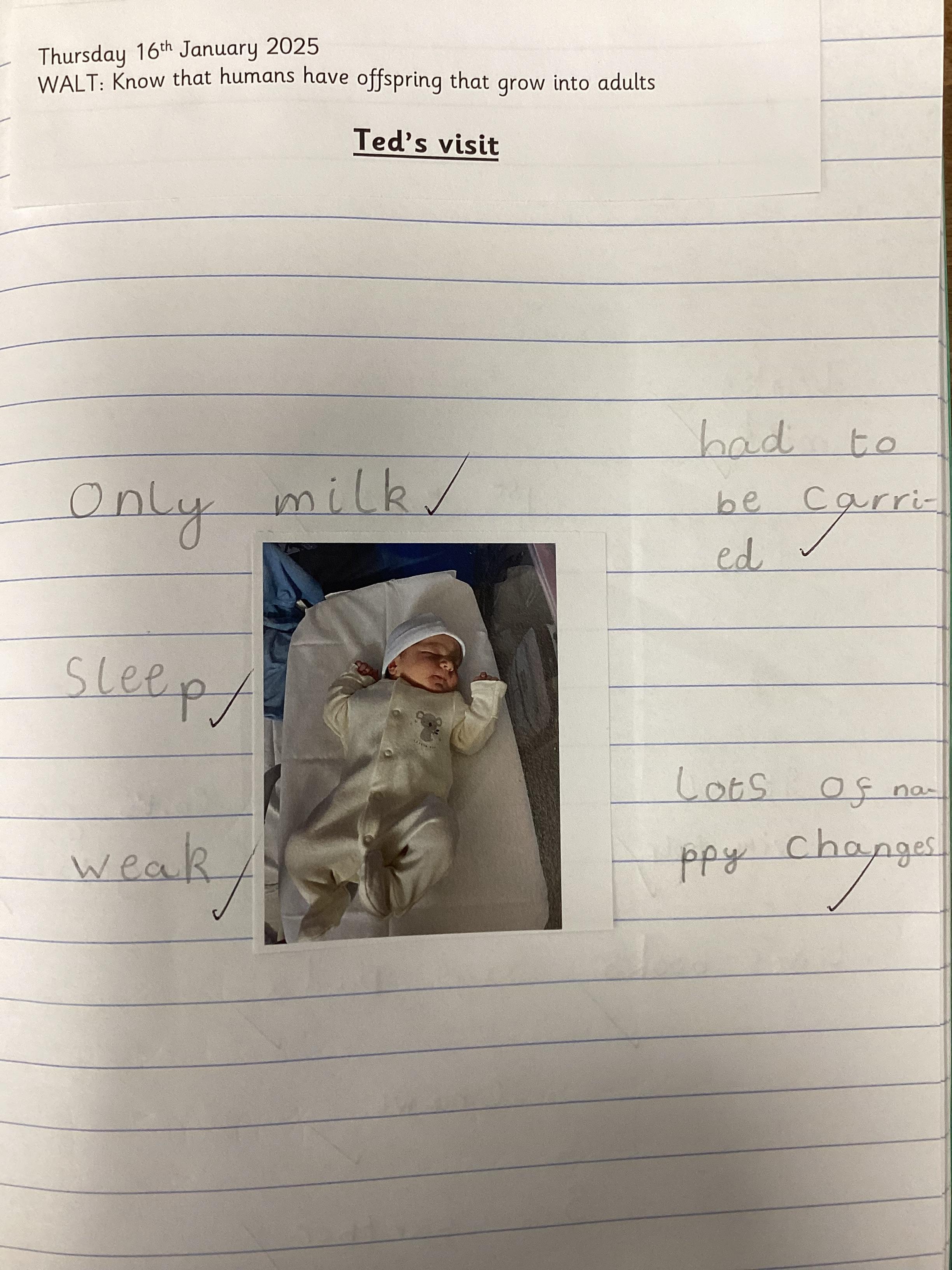 As part of our learning about humans, we had a visit from baby Ted this week. The children looked at all the changes that have happened since Ted was a newborn baby, and are looking forward to his next visit when he'll be one year old.