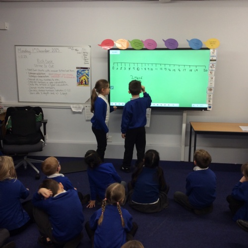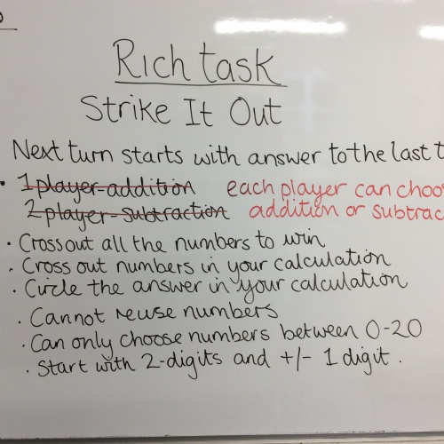 Pupils took part in a Rich Task for Maths today. The children had to watch 2 people play a numbers game and work out what the rules are. Pupils then came up with a list of rules and played the game for themselves. They realised the game only ends when a player cannot complete their number sentence.