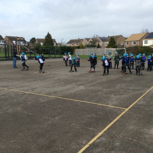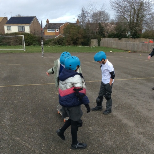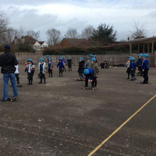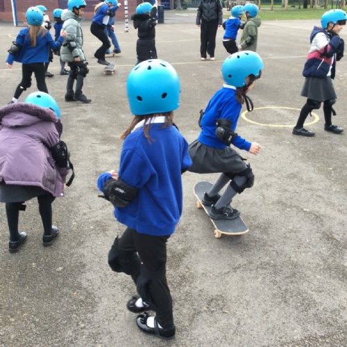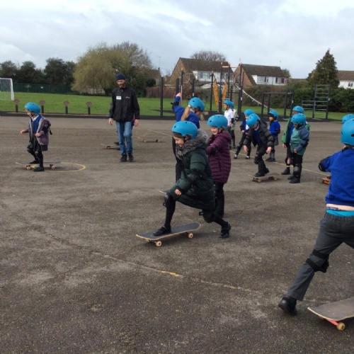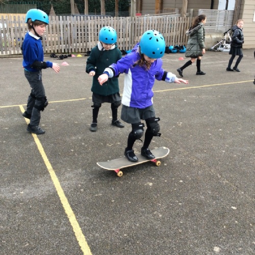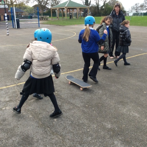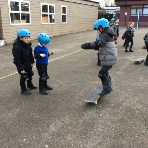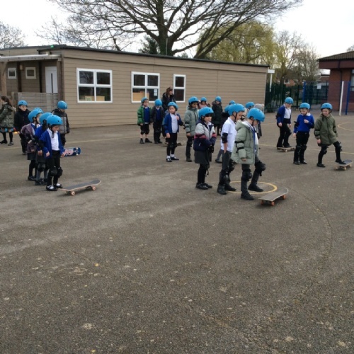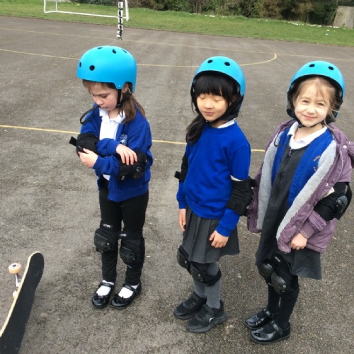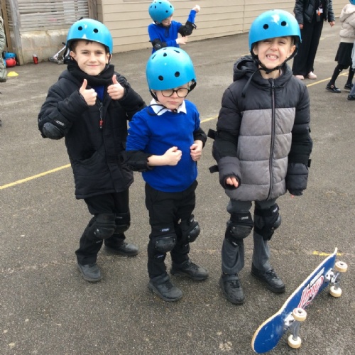 Pupils enjoyed something a bit different today... a skateboarding lesson! After learning how to correctly put on the safety gear, Year 3 pupils learnt out to perform jump tricks on the skateboards before having a go at skateboarding across the playground. Children showed great perseverance skills and a resilience when learning these new skills. Well done Year 3!